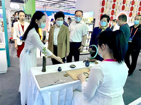 河北省副省长夏延军,河北省文化和旅游厅党组书记、厅长那书晨等领导一行参观了古城香业展位。古城香业香文化总监杨雪艳为领导讲解了曾经在唐宋时期风靡一时的行香方法——古法篆香。